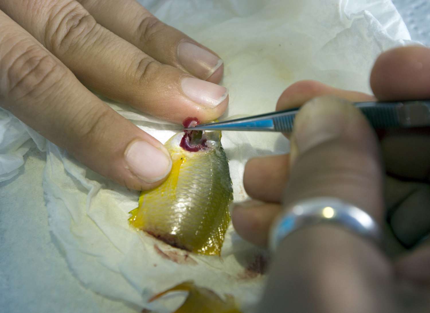 Biologist Jodie Rummer dissects a fish she caught at one of the carbon-dioxide vent sites off Papua New Guinea as part of her effort to understand how or if chemically altered water affects fish.
