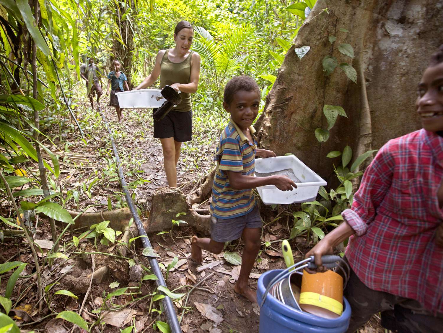 Children help biologist Joy Smith cart plastic tubs of coral and sediment through the jungle on Normanby Island, Papua New Guinea. She is studying whether CO2 might harm tiny animals at the bottom of the marine food chain. View photo gallery →