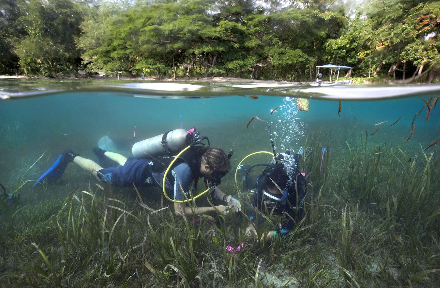 Biologists Sam Noonan, left, and Miwa Takahashi collect sea grass in Papua New Guinea. Sea grasses, which are expected to increase as the ocean becomes more acidic, grow far faster near the CO2 vents.