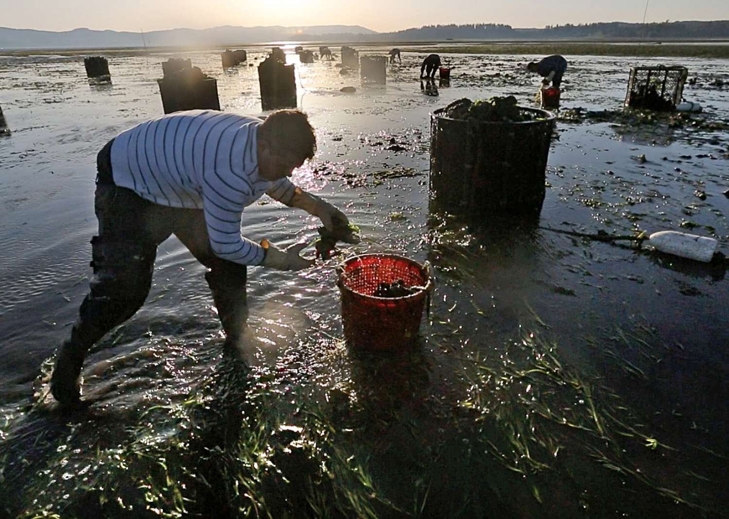 A worker harvests oysters from the Nisbet family’s Goose Point Oyster Co. in Willapa Bay. After ocean acidification started killing billions of baby oysters along Washington’s coast, both in the wild and in hatcheries where the Nisbets bought their oyster seed, the family took a radical step. They opened a hatchery in Hawaii. View photo gallery →